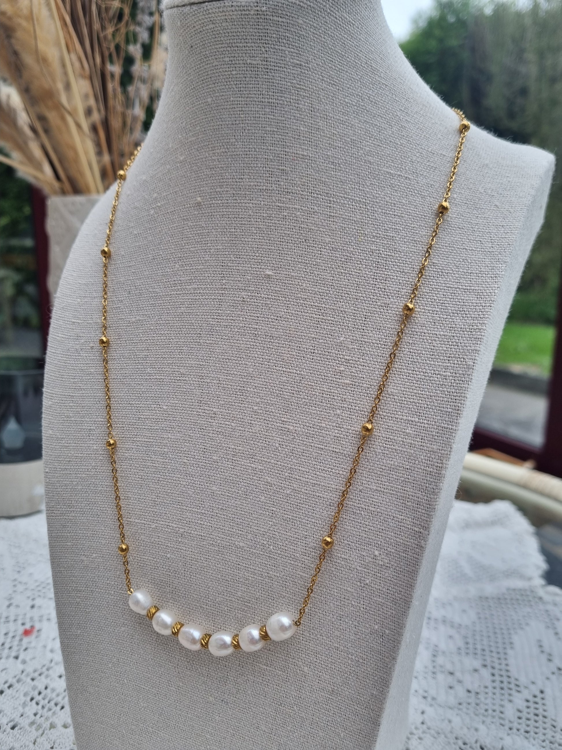 Découvrez le collier “Daphné”, une pièce exquise ornée de perles d’eau douce qui exhalent élégance et sophistication. Chaque perle est délicatement entrecoupée de petites perles dorées, ajoutant une touche de luxe à cette pièce intemporelle.