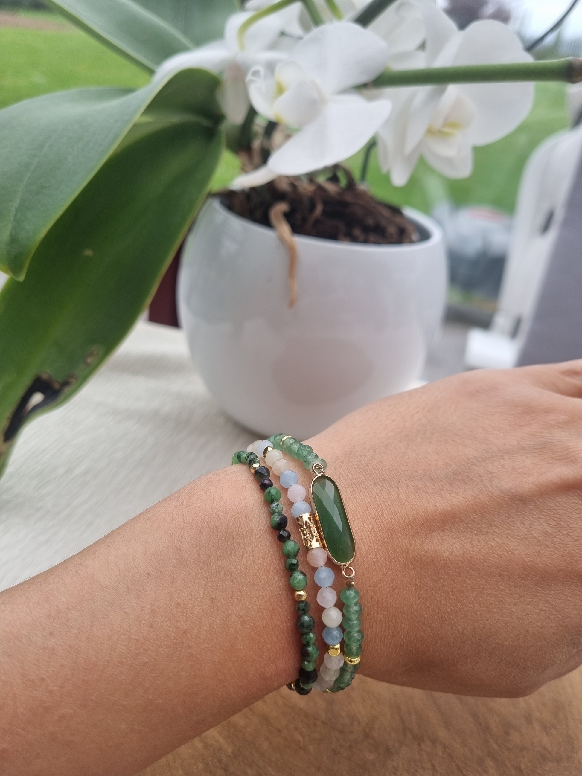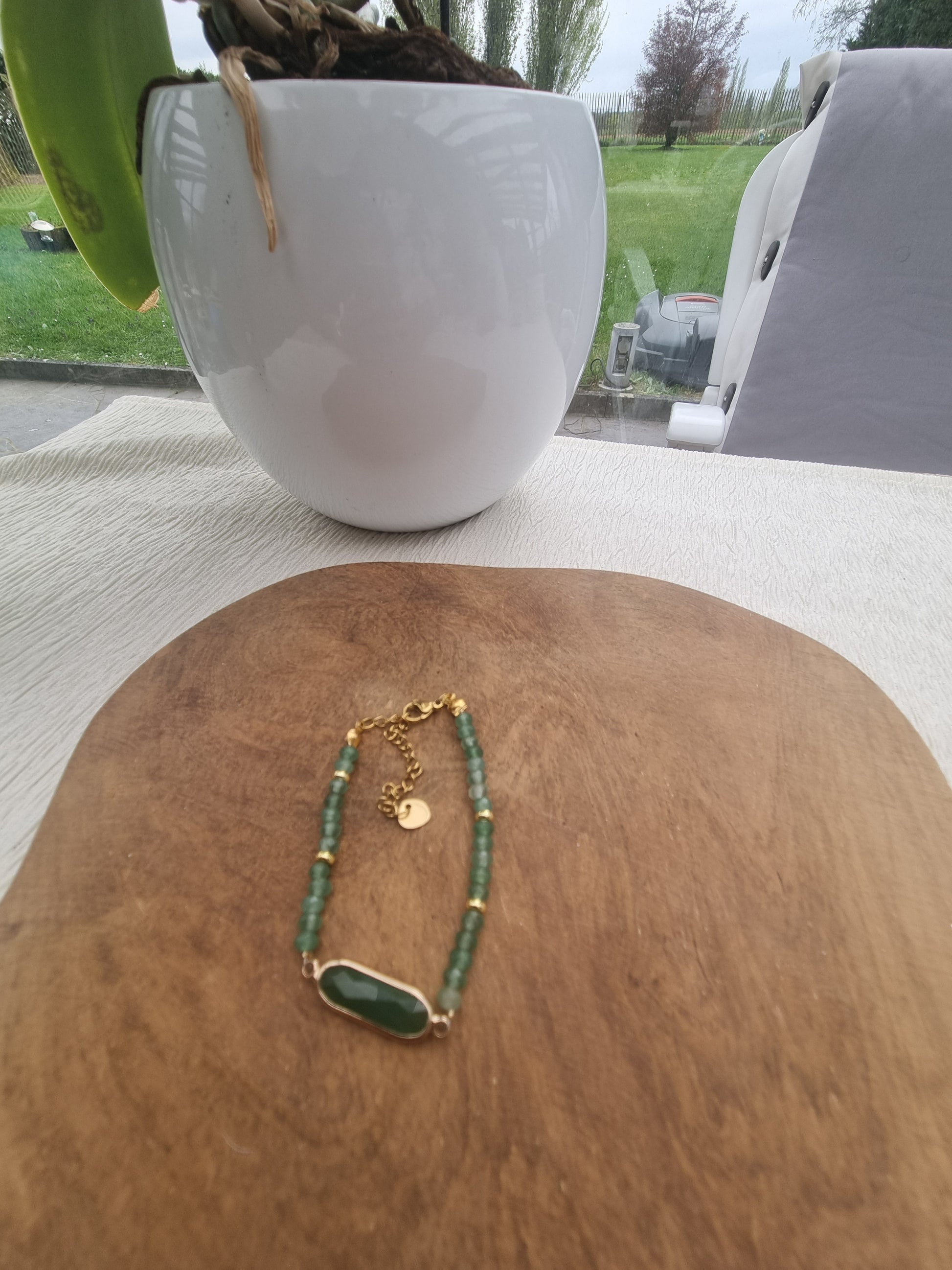 Ce bracelet est conçu avec une série de perles de jade vert, entrecoupées de détails dorés pour une touche de raffinement. Au centre se trouve un pendentif de jade ovale, majestueusement serti dans une monture dorée qui rehausse sa richesse chromatique. Le fermoir doré complexe, accompagné d'une charmante breloque en forme de cœur, complète ce bijou.