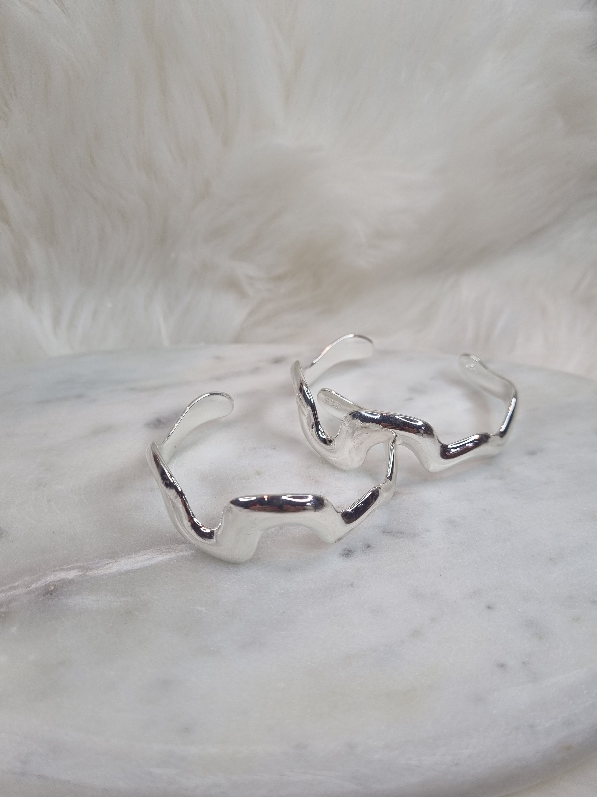 Ces bracelets en argent captivent par leur forme ondulée, évoquant le mouvement gracieux des vagues. Leur conception ouverte et aérée les rend confortables à porter et faciles à ajuster à différentes tailles de poignet. Le fini miroitant de l'argent poli garantit que ces pièces accrocheront la lumière et les regards, les rendront idéales pour toute occasion, que ce soit pour rehausser une tenue de journée ou compléter une tenue de soirée avec sophistication. Ajoutez une touche de modernité à votre collection de bijoux avec ces bracelets uniques qui allient la beauté intemporelle de l'argent à un design audacieux et contemporain.
