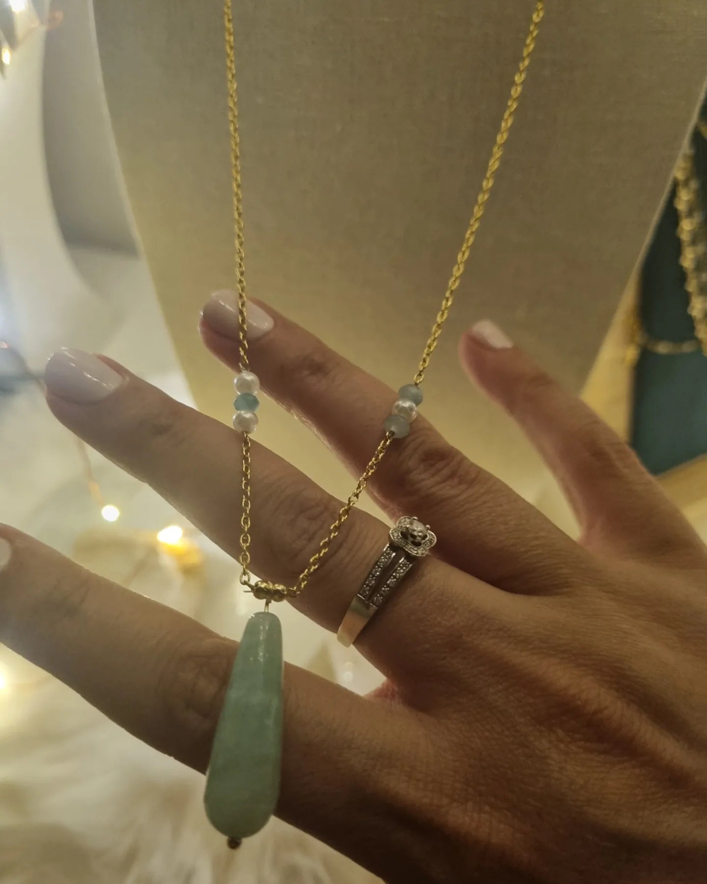 Découvrez l’élégance angélique avec le collier Angel, mettant en vedette un pendentif en pierre d’angélite de vert pâle en forme oblongue, suspendu à une chaîne dorée raffinée en acier inoxydable. Ce collier est agrémenté d’accents de pierres vert clair et de perles d’eau douce naturelles, apportant une harmonie de couleurs douces et une touche de sophistication.