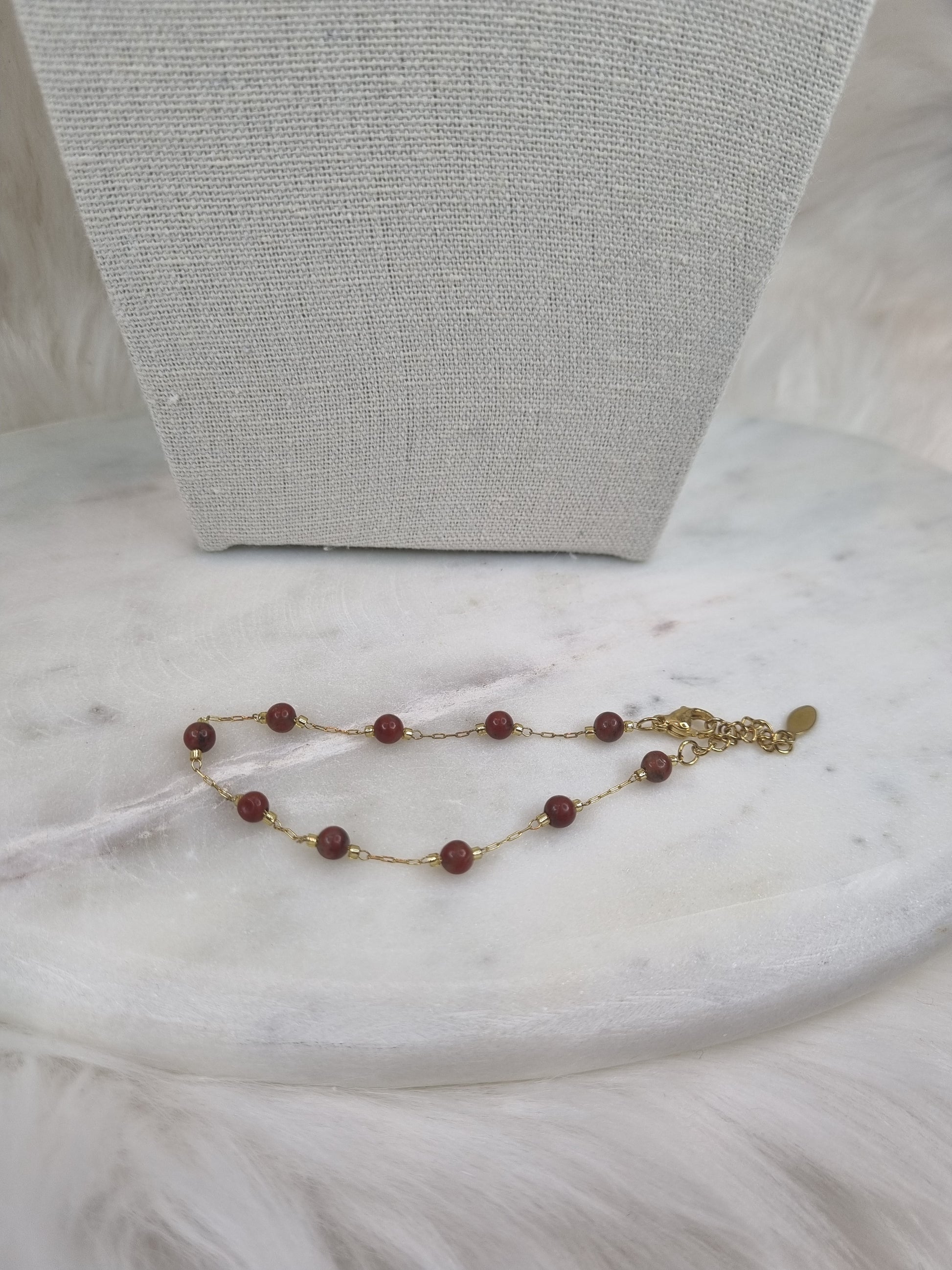 Le bracelet Bordeaux en or fin est un hommage à l’élégance classique, rehaussé par la profondeur des perles bordeaux qui le ponctuent. Chaque perle est soigneusement disposée pour créer un équilibre visuel, offrant une allure sophistiquée à celui ou celle qui le porte.