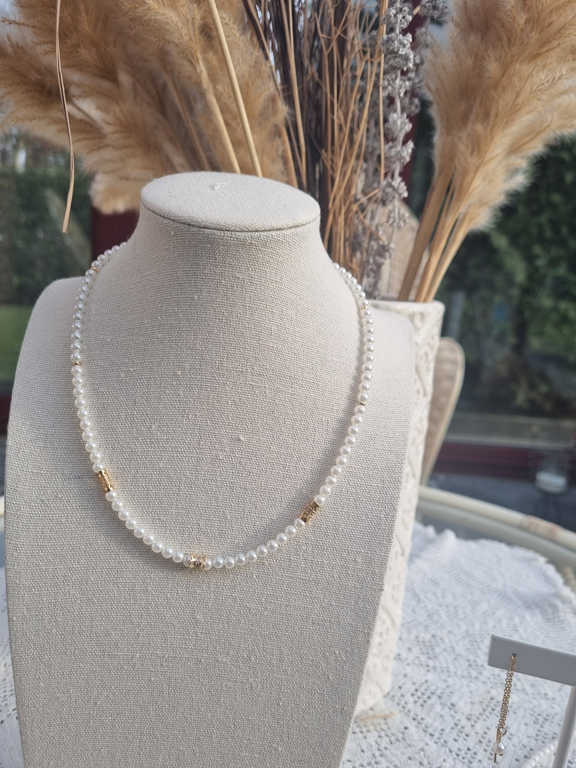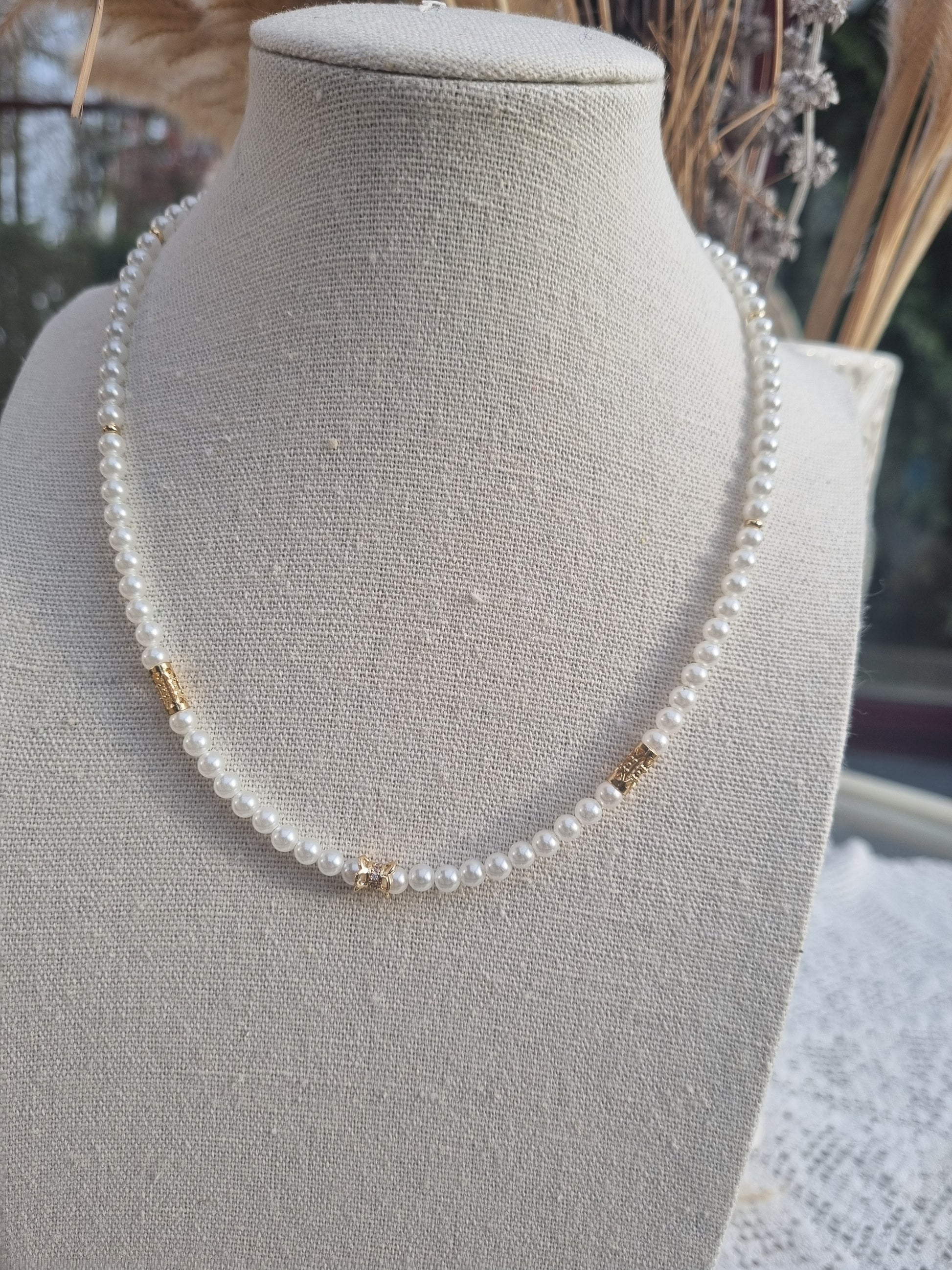 Collier de perles à l'éclat profond, agrémentées d'éléments en or enrichissant son allure. La finesse de chaque perle s'allie à la chaleur de l'or pour un résultat d'une élégance absolue. Cet accessoire habillerait avec distinction toute tenue de cérémonie ou de soirée.