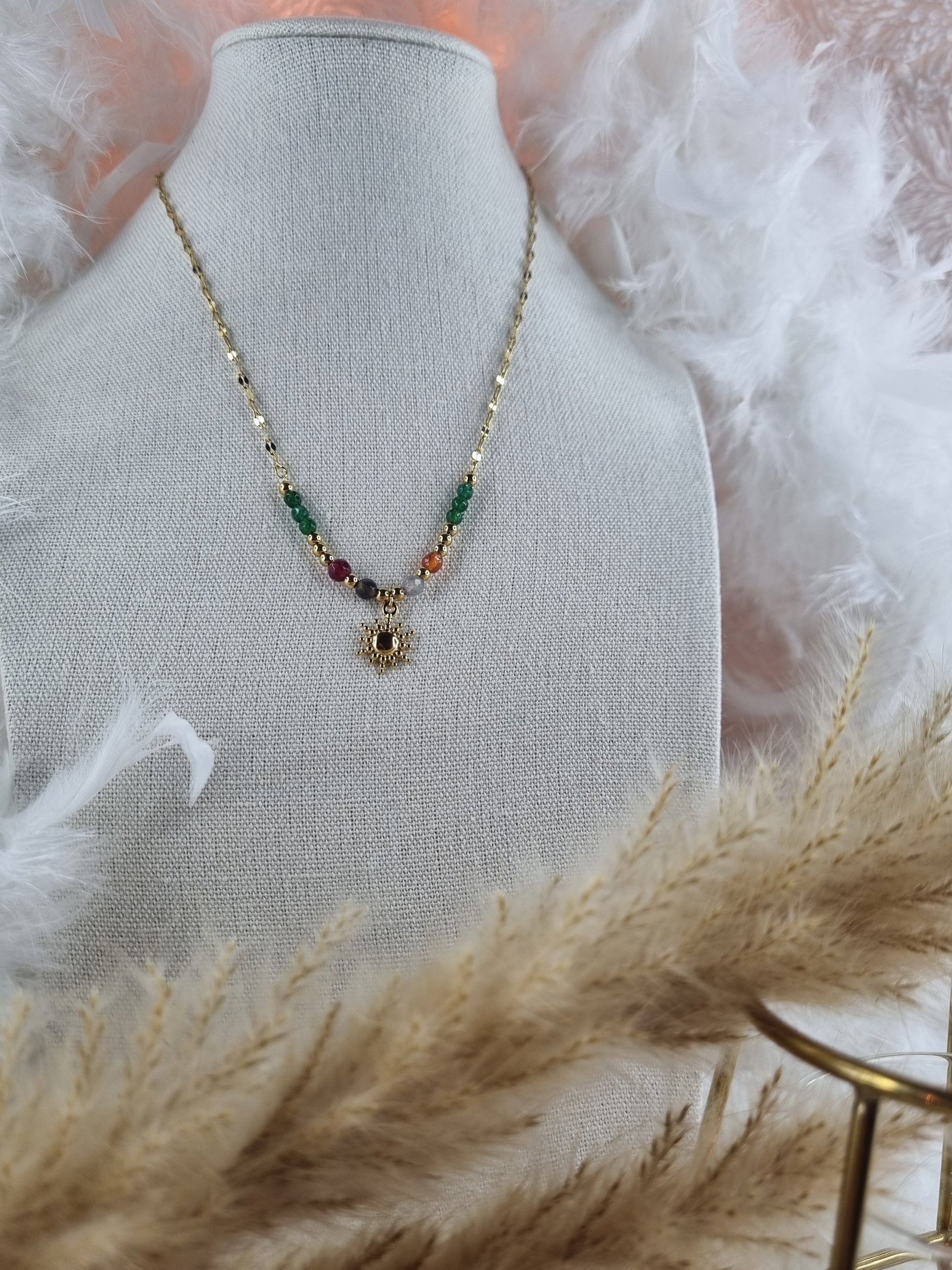 Sublimez votre tenue avec notre Collier Élégance Dorée, une création qui allie la chaleur du doré à la vivacité des pierres colorées. Ce bijou est une célébration de la finesse et de la couleur, conçu pour les amateurs de mode qui n'ont pas peur de briller.