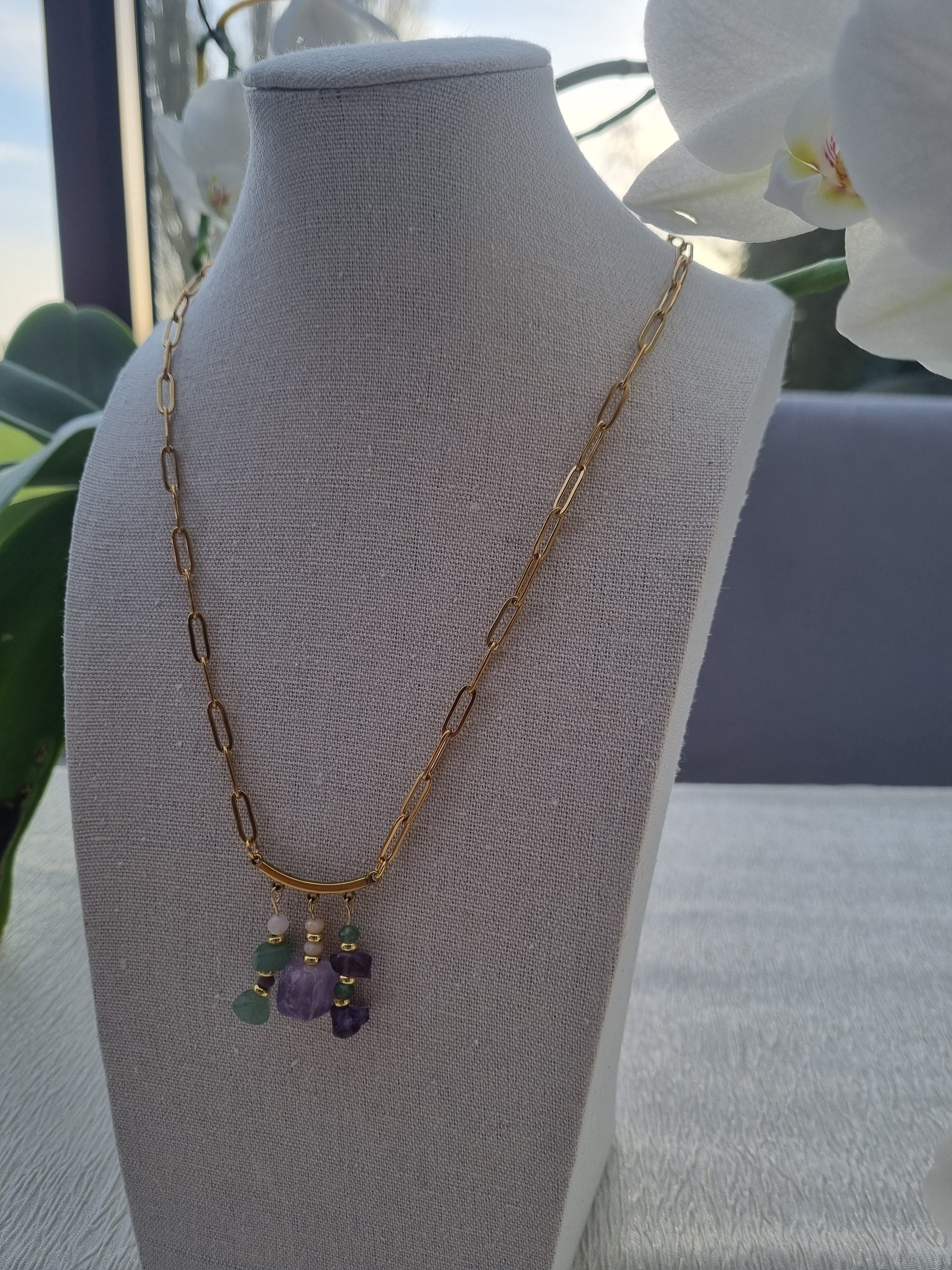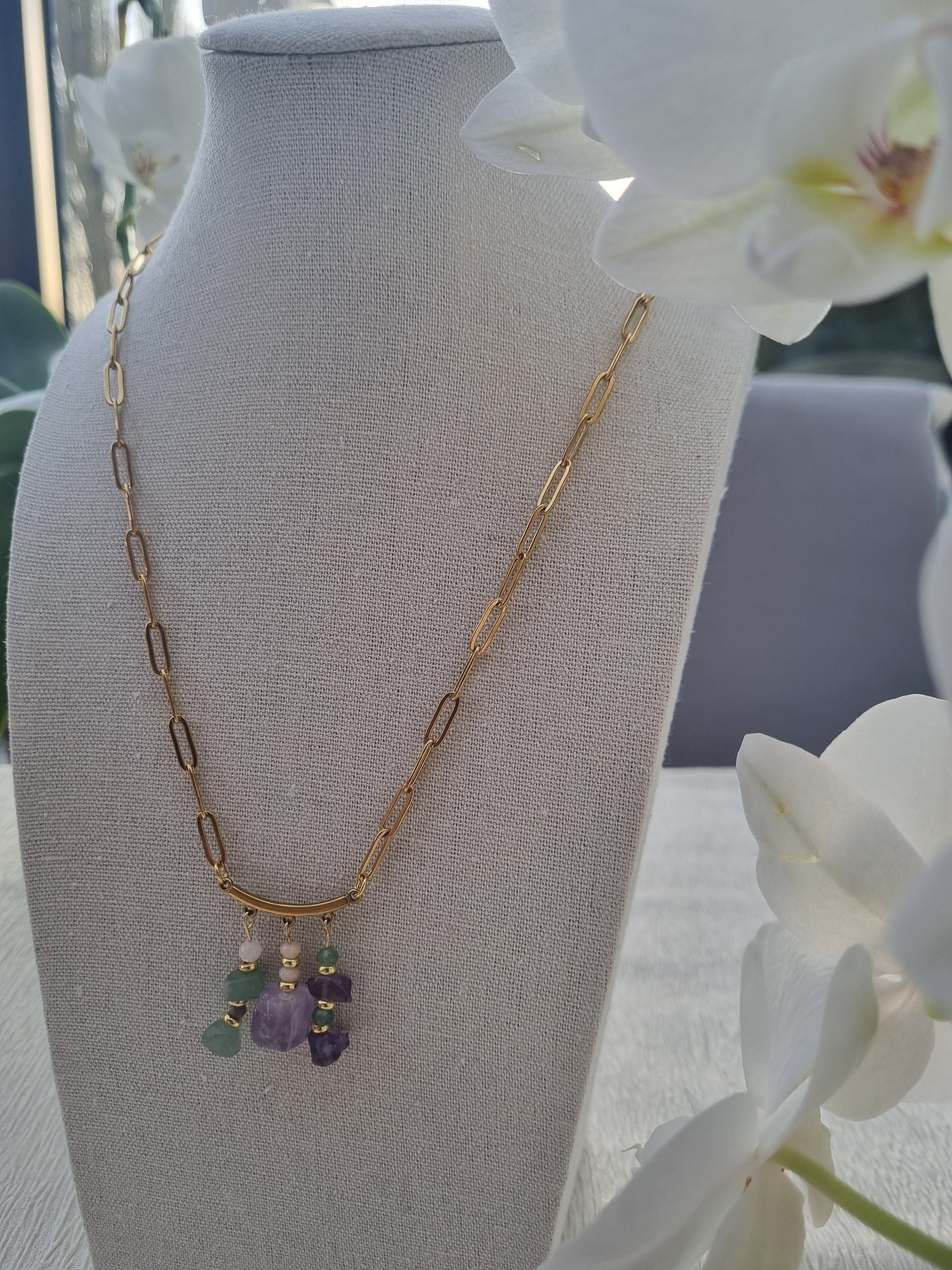 Découvrez l'harmonie des couleurs et l'élégance intemporelle avec notre Collier Élégance en Améthyste et Péridot. Ce bijou raffiné arbore une chaîne dorée asymétrique, composée de maillons aux formes et tailles variées. Au centre, une barre incurvée en métal doré est ornée de pendentifs délicats : des améthystes violettes profondes et des péridots verts lumineux, séparés par de fines entretoises dorées. Un équilibre parfait entre sophistication et charme naturel, présenté sur un buste gris clair qui souligne la beauté du collier. Ajoutez une touche d'élégance à votre tenue avec ce collier unique.