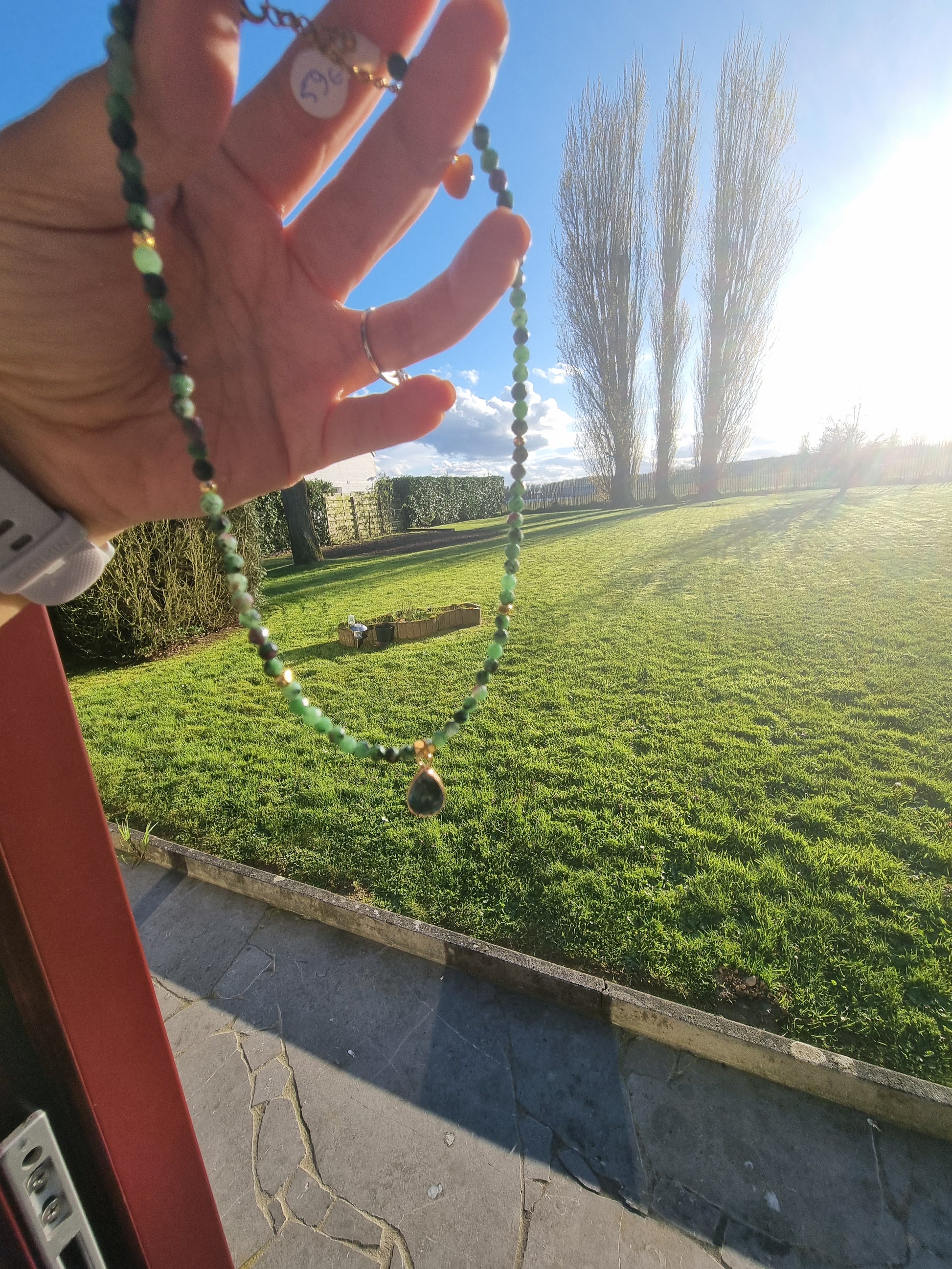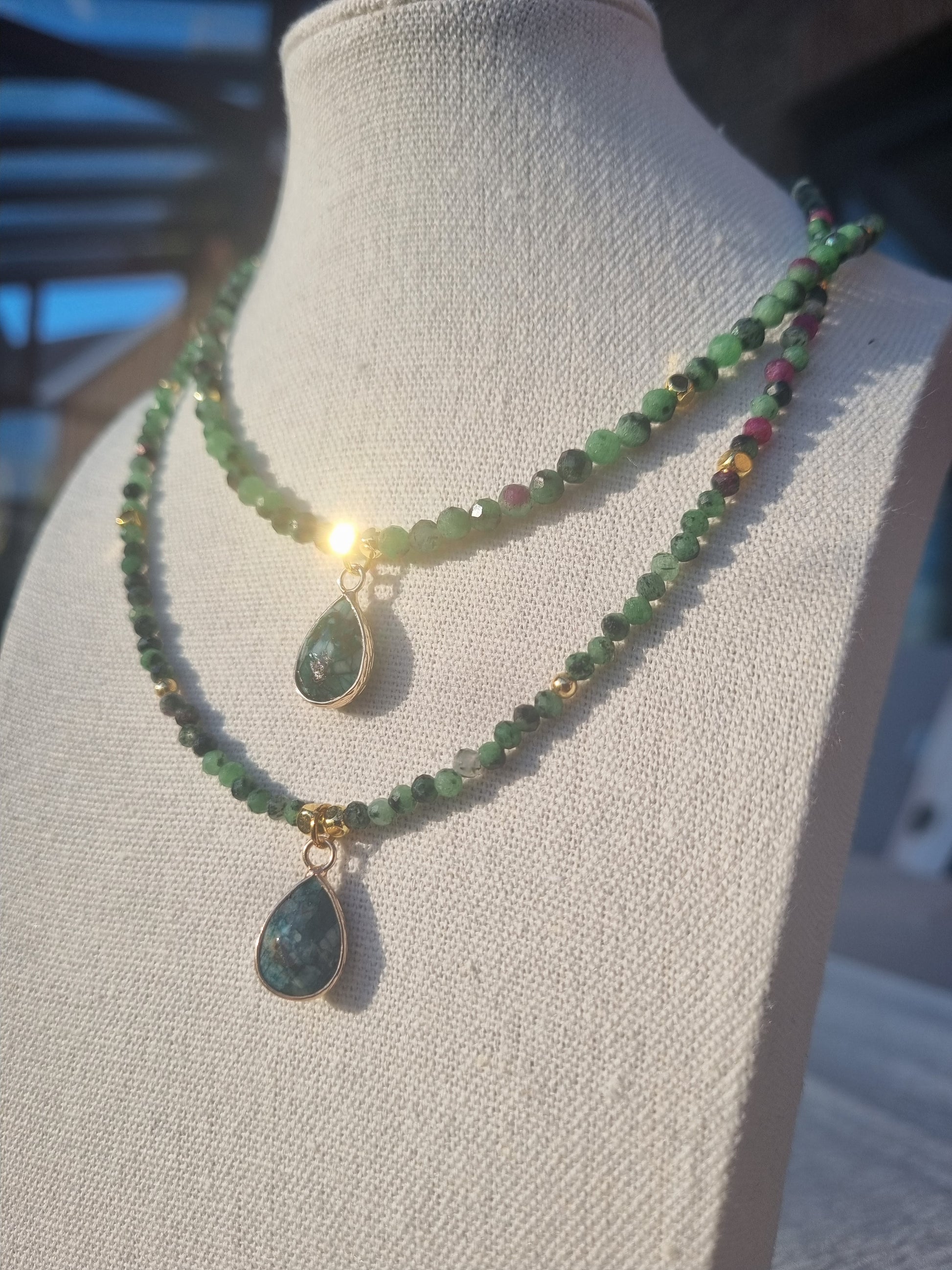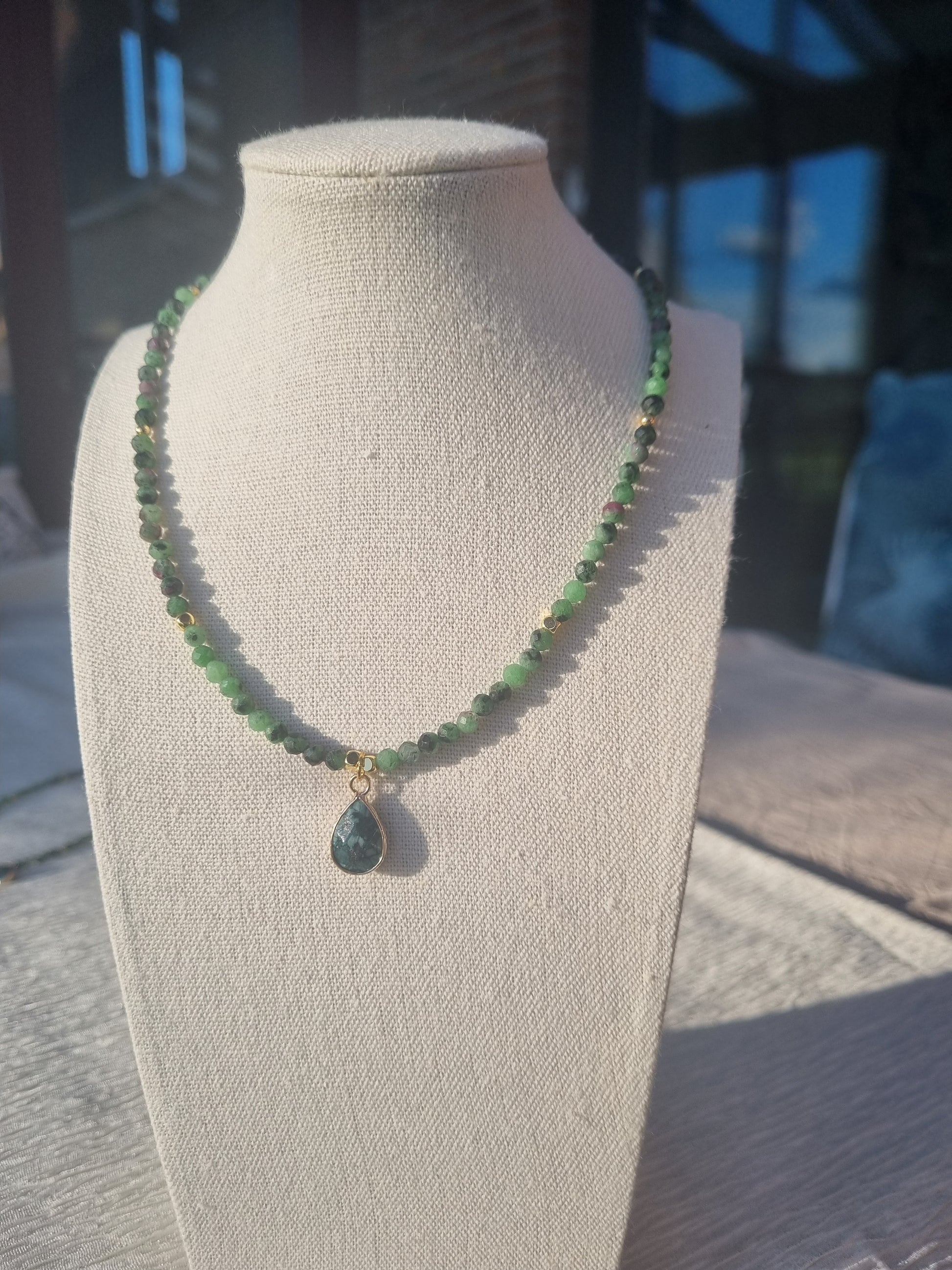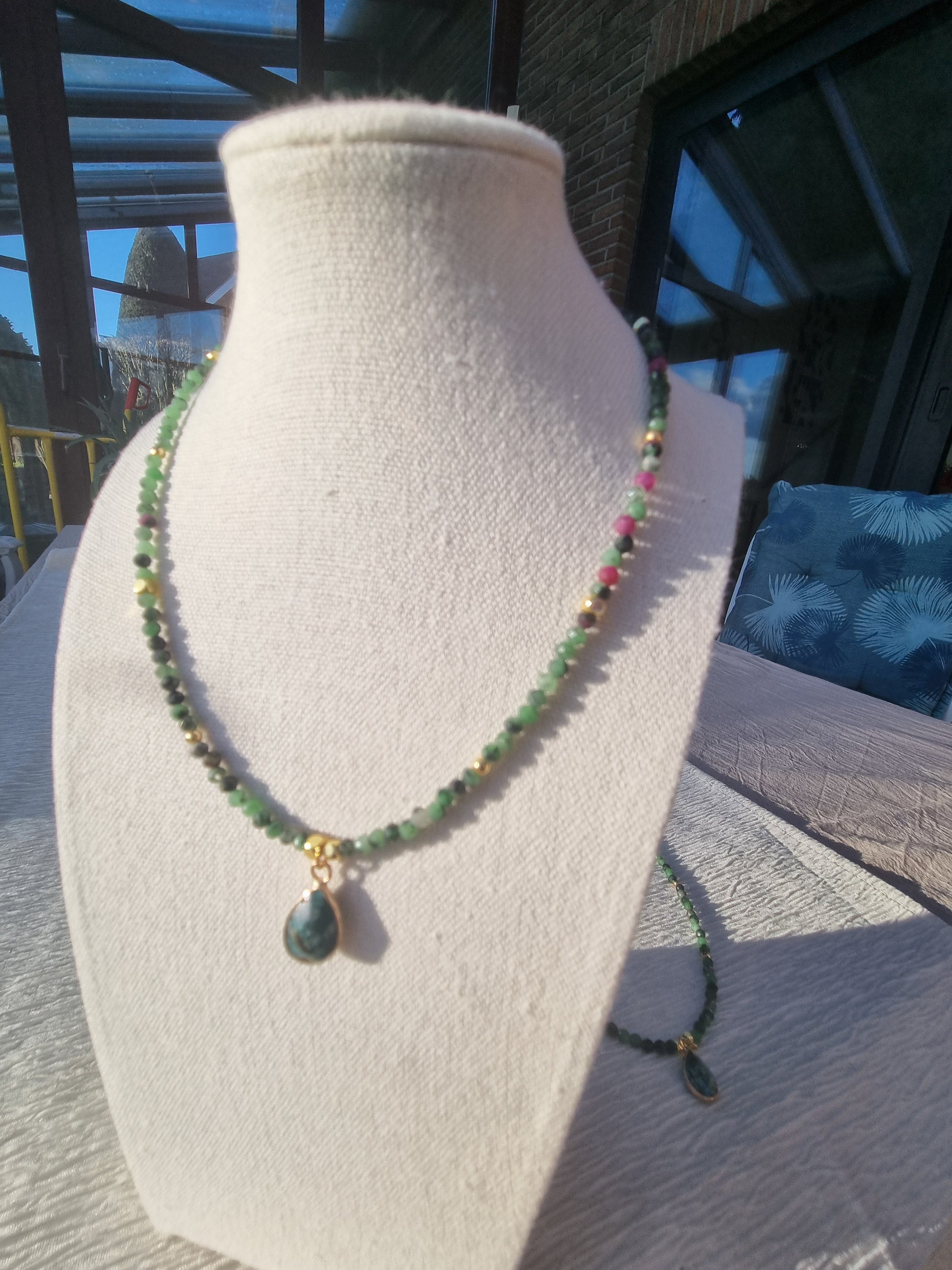 Le collier présente un design simple et élégant, avec une succession de petites perles semis-précieuse en tourmaline vertes délicatement nuancées. Des perles roses espacées ajoutent une touche de couleur contrastante. Le pendentif est en pierre semi-précieuse avec des veines distinctes en rose, suspendu par une attache dorée qui complète l’ensemble.