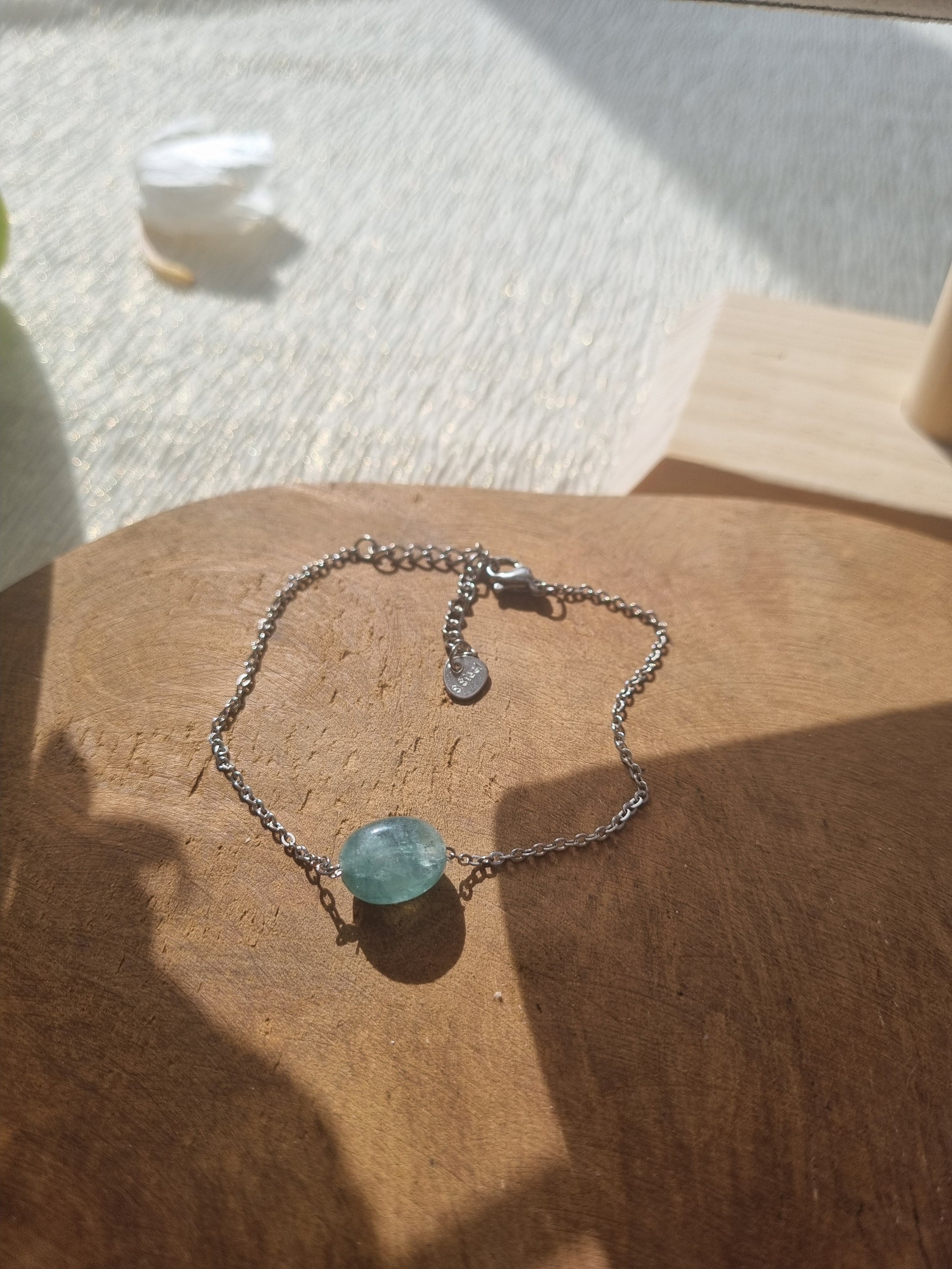 Ce bracelet est une fusion de tranquillité et de résistance; il présente une perle d'aigue-marine apaisante accrochée à une chaîne en acier inoxydable robuste. La couleur sereine de la pierre évoque la clarté des eaux calmes, tandis que le métal offre un contraste moderne avec sa finition éclatante. C'est un choix idéal pour ceux qui préfèrent les bijoux qui allient l'élégance naturelle des gemmes avec la longévité de l'acier, et c'est également un cadeau parfait pour transmettre un sentiment de paix et de bien-être.