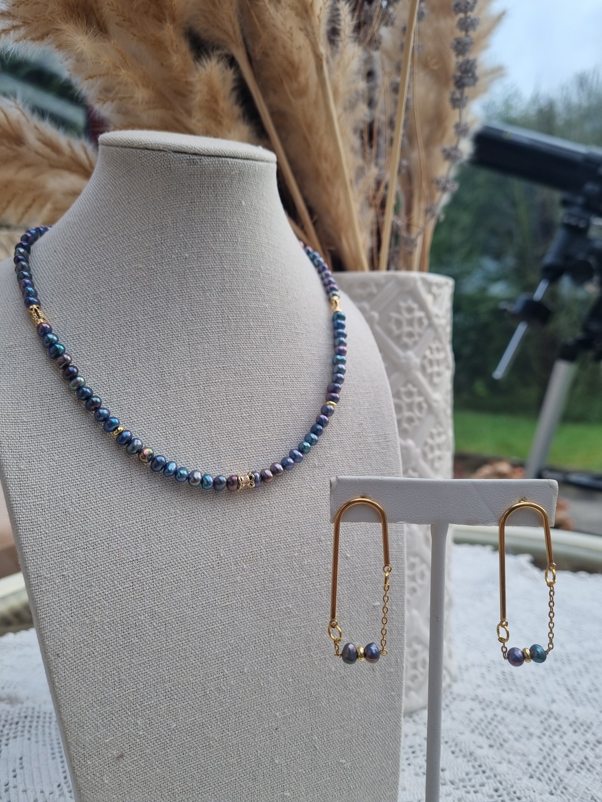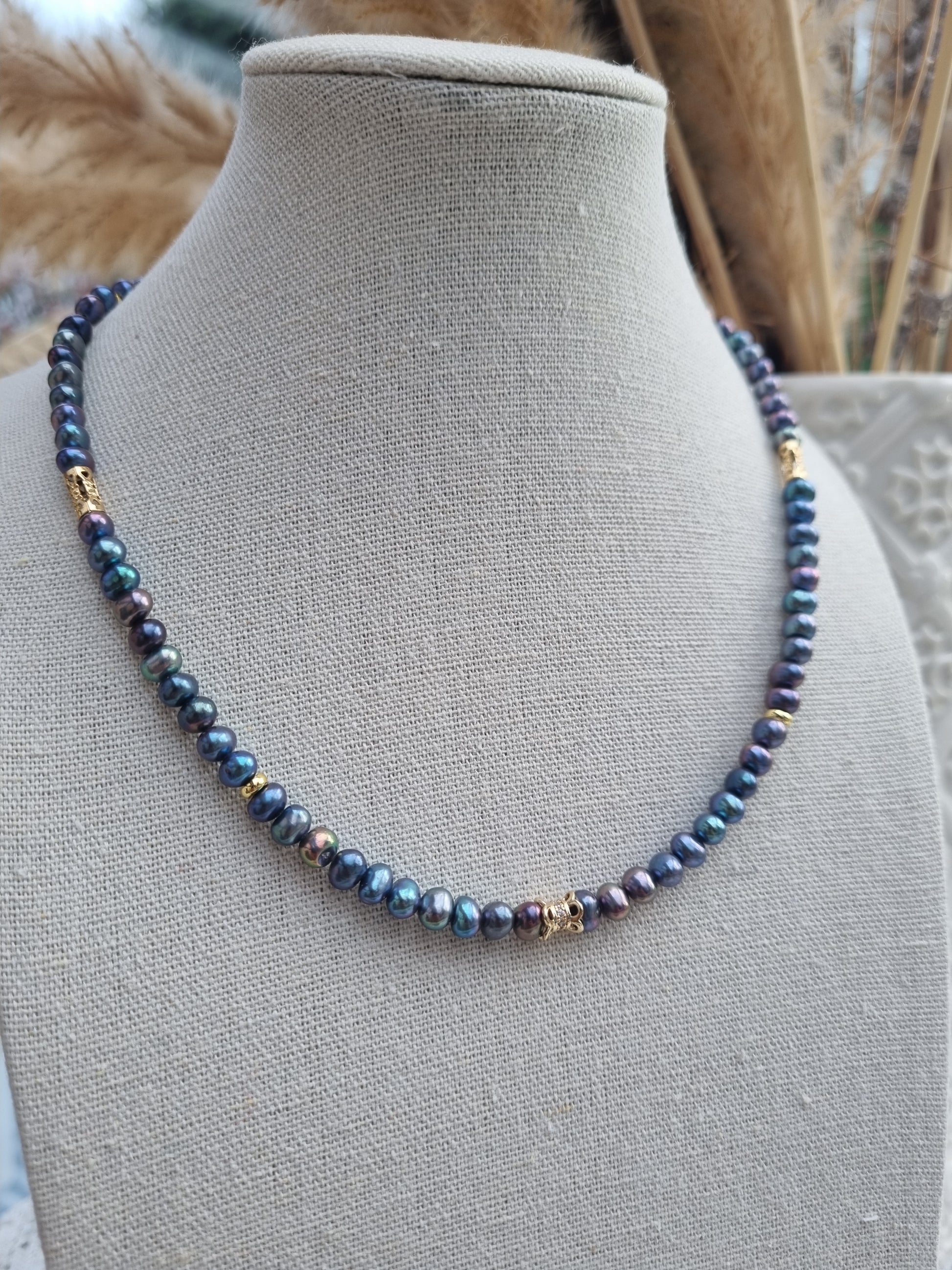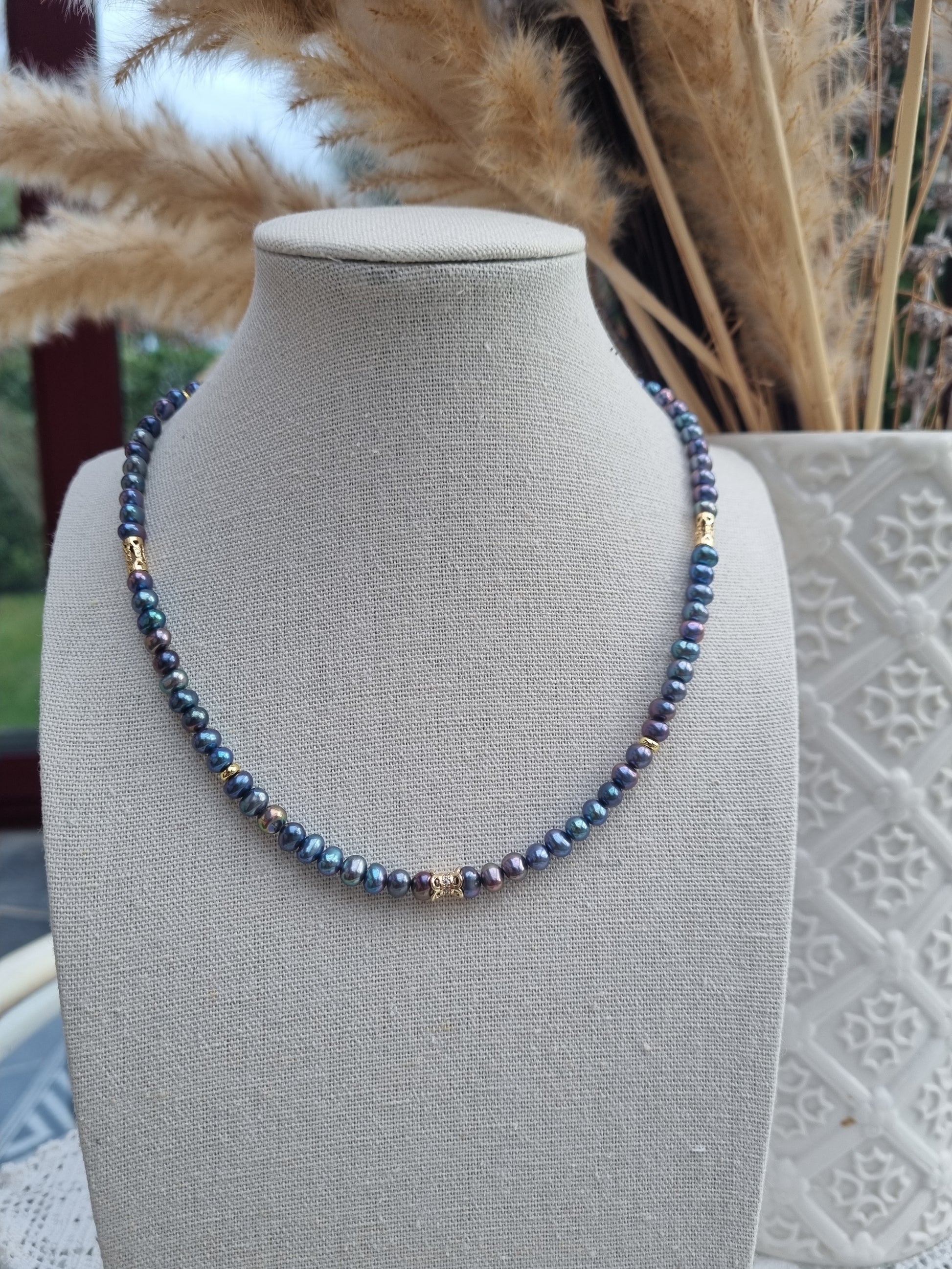 Découvrez l'éclat de notre collier artisanal, composé de perles d'eau douce naturelle aux reflets changeants, qui voyagent entre les profondeurs du bleu océan et les mystères du pourpre nocturne. Ponctuées d'accents dorés évoquant l'élégance intemporelle, ces gemmes sont un hommage à la beauté naturelle et à l'artisanat d'exception. Ce collier est une promesse de style et de distinction,